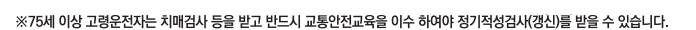 75세 이상 고령운자는 치매검사 등을 받고 반드시 교통안전교육을 이수 하여야 정기적성 검사(갱신)를 받을수있습니다.